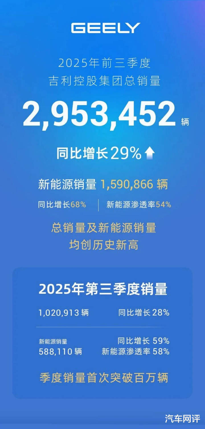 近日,吉利控股集团公布了2025年第三季度的销量数据,其最引人注目之处,莫过于其单季度销量上。今年第三季度,吉利控股集团季度销量首次突破百万辆,达到1,020,913辆,同比增长28%。尤其值得注意的是新能源板块,不仅收获588,110辆销量,同比大幅增长59%,其渗透率进一步提升至58%。